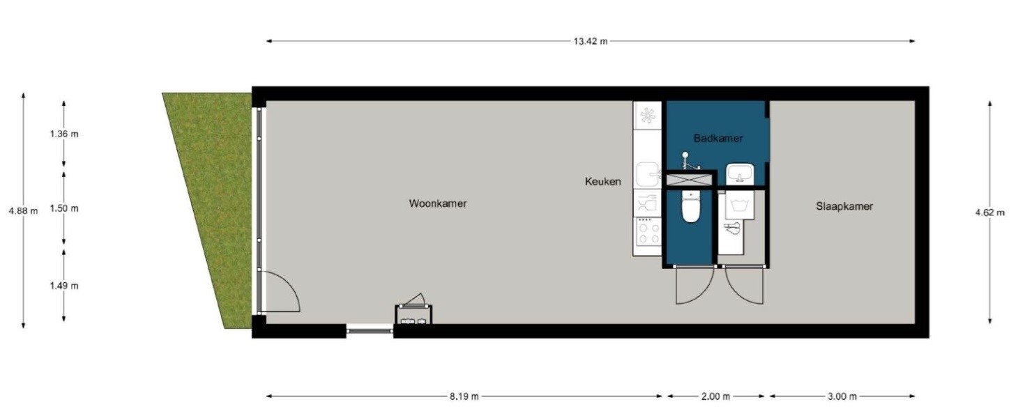 Via de tuin kom je binnen in de woonkamer welke toegang geeft tot alle vertrekken. Woonkamer met veel lichtinval, toegang tot de tuin van zo'n 5m² en mooie keuken, inpandige berging met aansluiting voor wasmachine en droger. Ruim slaapgedeelte met en-suite badkamer voorzien van mooi tegelwerk, inloopdouche en wastafel.