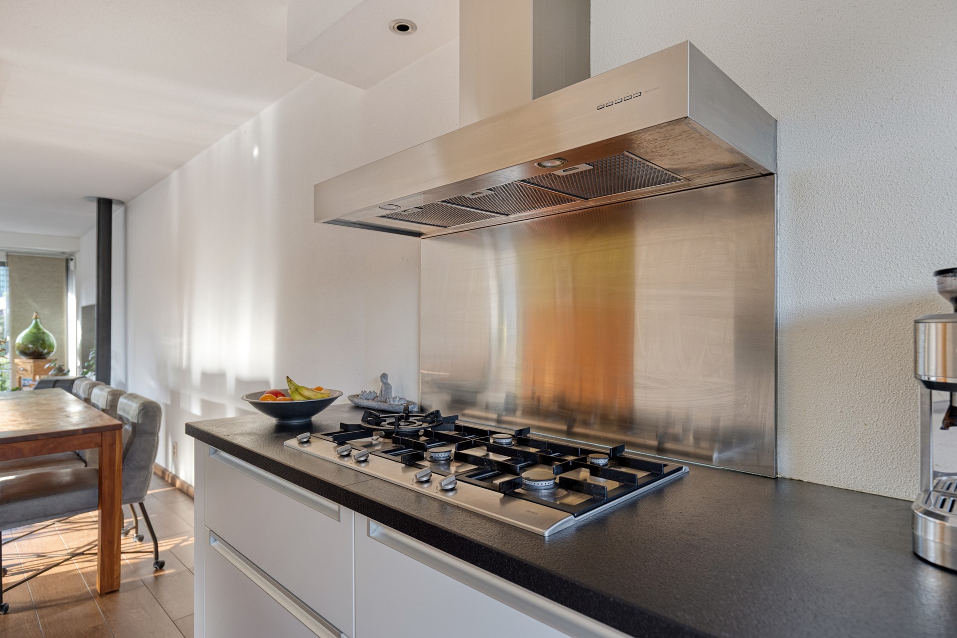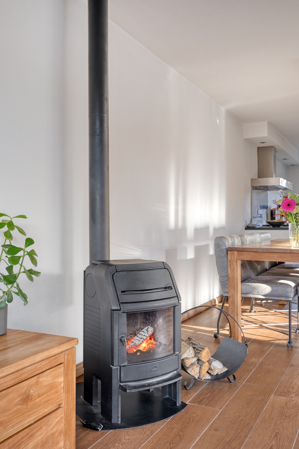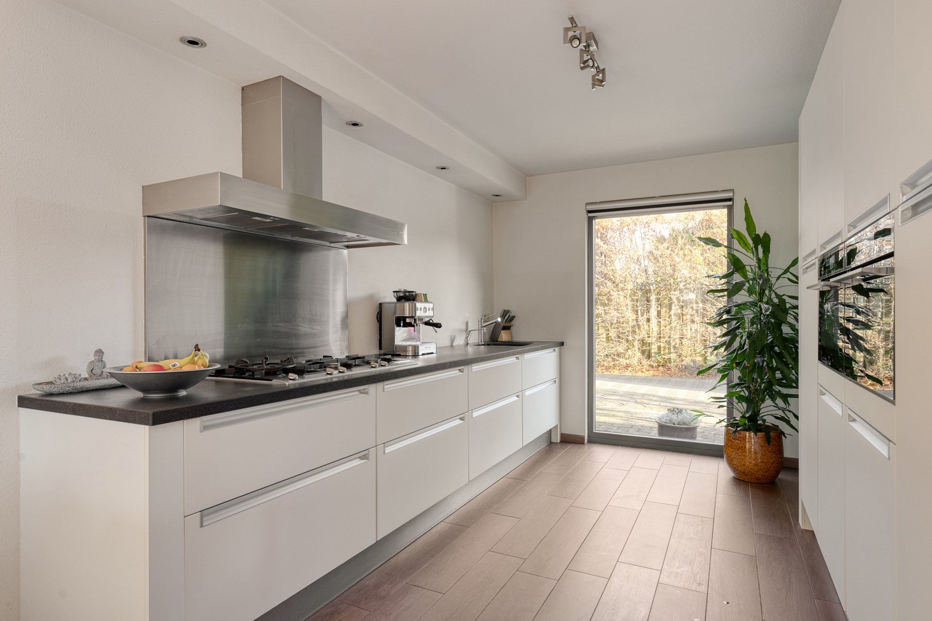 Begane grond. Via de ruime hal bereik je de lichte woonkamer met vloerverwarming, een fijne houtkachel en grote raampartijen. De dubbele glazen schuifdeuren zorgen voor een prettige verbinding met de fraai aangelegde tuin. Dankzij de hoekligging geniet je hier van veel licht en privacy. De moderne open keuken is compleet uitgerust met onder andere twee combi-ovens (2022), een vaatwasser, koel-/vriescombinatie en een Quooker.