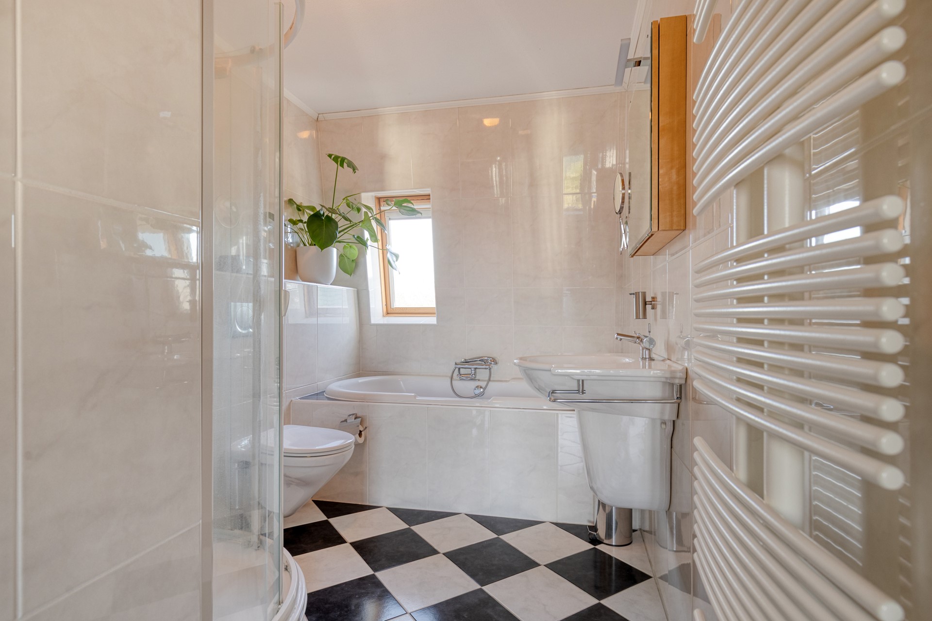 Tweede verdieping. Hier bevinden zich nog twee slaapkamers, de cv-opstelling en de ruime badkamer met whirlpoolbad, douche, wastafel en toilet.