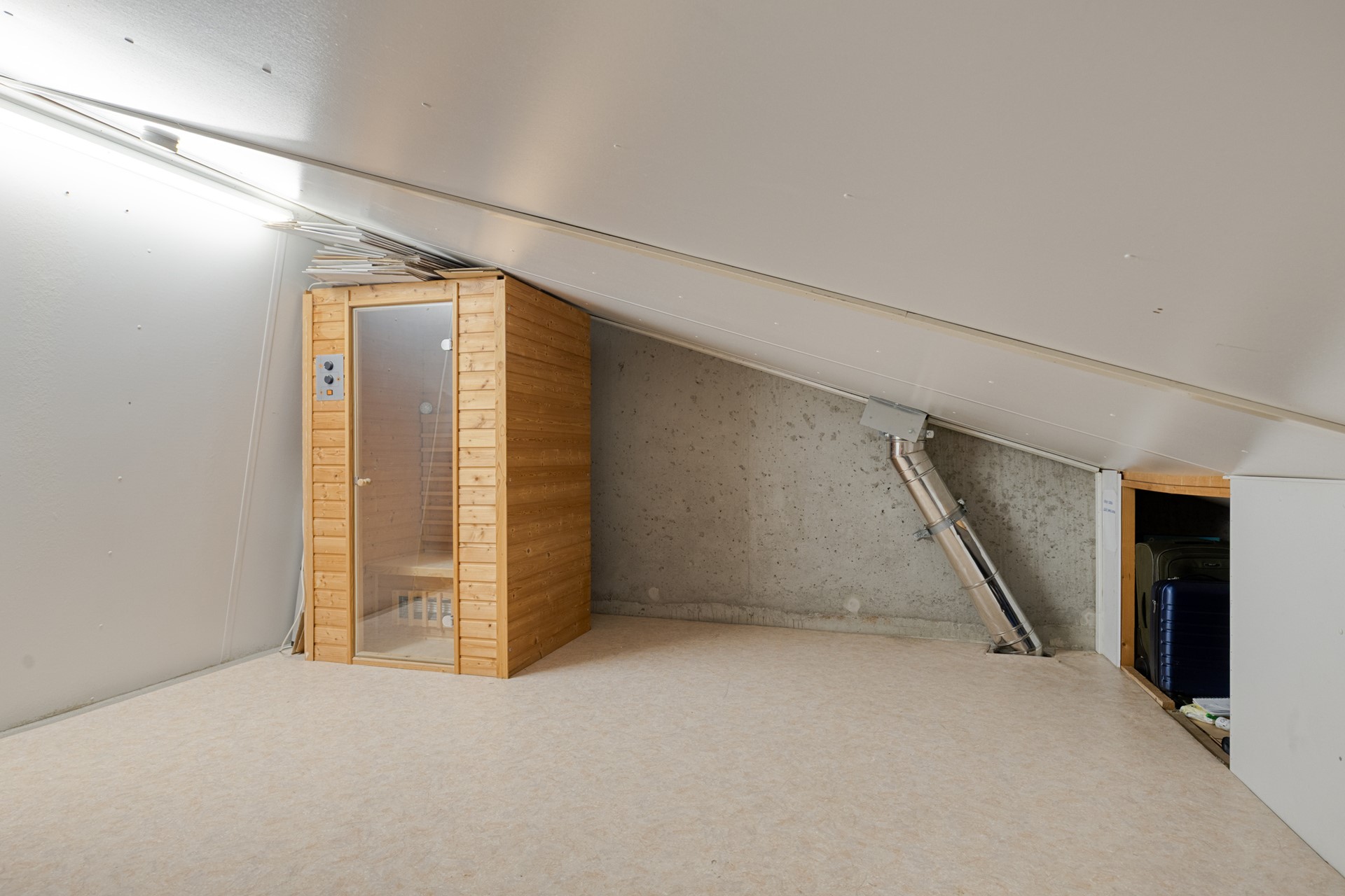 Zolder. Via een vlizotrap bereik je de verrassend grote zolderverdieping met sauna. Deze ruimte voelt als een extra verdieping en biedt volop mogelijkheden. Er bestaat de mogelijkheid om de cv-ketel te verplaatsen en een vaste trap naar de zolder te realiseren.